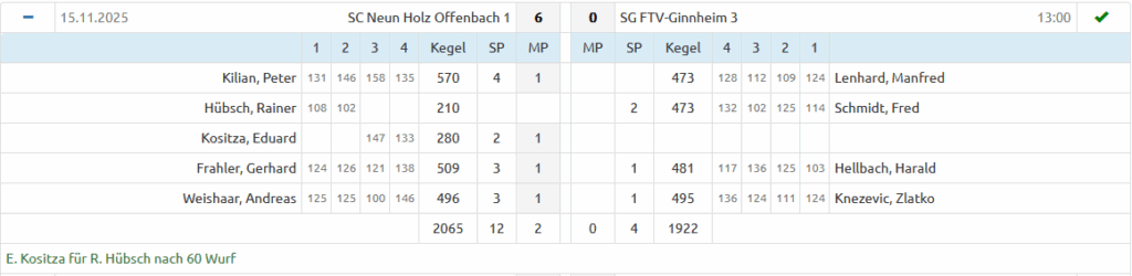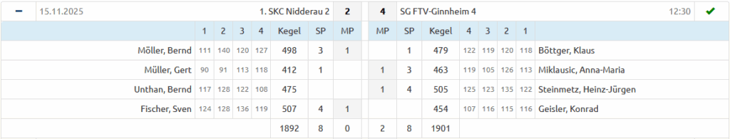 Zwei Mannschaftspunkte für uns, und neun Holz Vorsprung reichten am Ende zu einem erkämpften 4:2 und 1901:1892, und dies bedeutete einen Auswärtssieg.