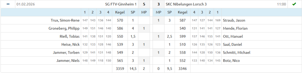 Torben (549 Holz) und Niels (565 Holz) bildeten den Schluß. Torben konnte sich zwei der Bahnen erspielen, musste aber aufgrund von nur 9 Holz seinen Mannschaftspunkt abschreiben.