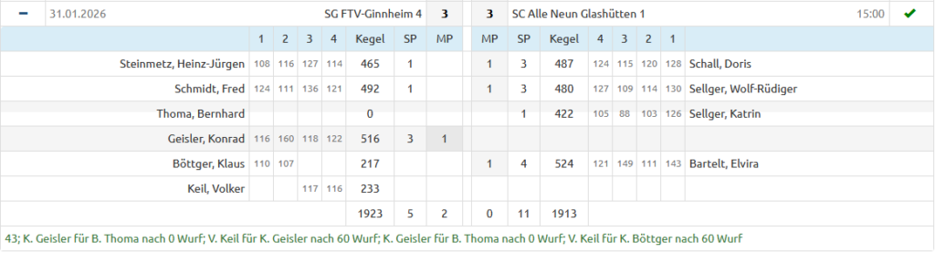 Heinz-Jürgen (465 Holz) und Fred (492 Holz) hatten beide leider nur jeweils einen Satz erspielen können, und so gingen die ersten beiden Mannschaftspunkte an die Gäste aus Glashütten.