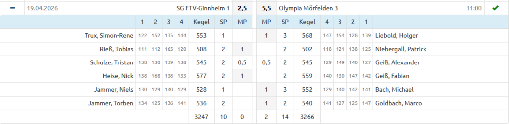 Den zweiten Teil dieses letzten Spieltages der Saison 2025/2026 eröffnete die erste Mannschaft, die am Sonntag, 19.04.2026 ab 11:00 die Olympia Mörfelden 3 zu Gast hatte.