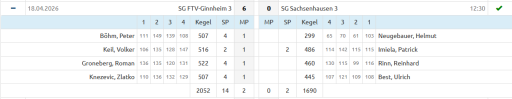 So wie eine Saison mit dem ersten Spieltag beginnt, endet sie auch mit dem letzten. In diesem Fall war es der 18.Spieltag der es für alle bedeutete, nochmal zuhause anzutreten. Die dritte Mannschaft hatte an diesem Samstag, dem 18.04. ab 12:30 die SG Sachsenhausen 3 auf den Bahnen im Clubhaus in Ginnheim zu Gast.