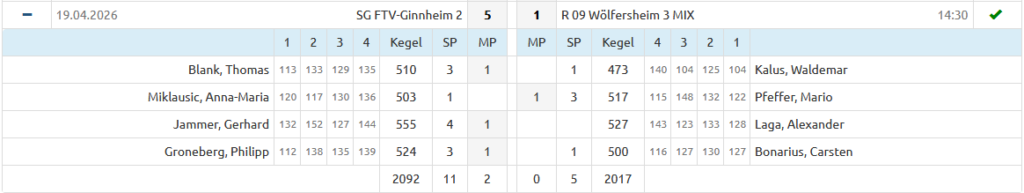 Gerhard (555 Holz) und Philipp (524 Holz) beendeten diese Begegnung. Starkes Spiel von Gerhard, der sich alle vier Sätze, den Mannschaftspunkt und mit dem letzten (gewollten) Kegel auch das Schnapszahl-Ergebnis von 555 Holz holte. Die Runde für alle war sicher!