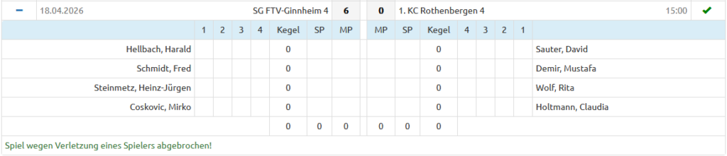 Als nun alle (inklusive der Technik) wieder bereit waren, passierte das was man niemandem wünscht. Einer unserer Spieler fiel um, und zog sich eine Platzwunde am Kopf zu. Da war die Aufregung natürlich groß, und der Schock saß erstmal tief. Nachdem der Rettungswagen alarmiert und vor Ort war wurde erstmal der Verunfallte vesorgt, und zur Beobachtung und weiterer Abklärung ins Krankenhaus gebracht. Klar war zu diesem Zeitpunkt nicht mehr als Spielen/Weiterspielen zu denken. Die Regularien besagen, das ein eventueller Nachholtermin in derselben Konstellation durchzuführen ist. Da die Spielerinnen und Spieler des KC Rothenbergen diesen Nachholtermin, der zu allem Überfluß noch zeitnah zu erfolgen hat, nicht realisieren konnten, wurde beschlossen die 2 Spielpunkte und somit den Sieg der SG FTV-Ginnheim 4 kampflos zu überlassen. Vielen Dank an den 1.KC Rothenbergen 4. Eine sportlich faire Geste. Ein feiner Zug und nicht selbstverständlich!